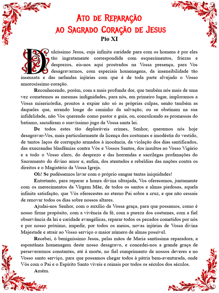 Ato de Reparação ao Sagrado Coração de Jesus. Padre Paulo Ricardo - publicado em 20/04/17. Em 1928, o Papa Pio XI entregou uma oração urgente a toda a Igreja: o ato de reparação.