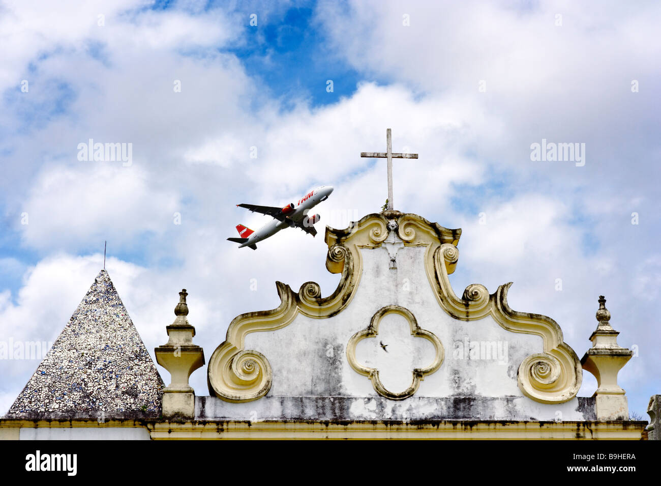Airplane over Igreja Nossa Senhora da Pena Porto Seguro Bahia Brazil South America Stock Photo