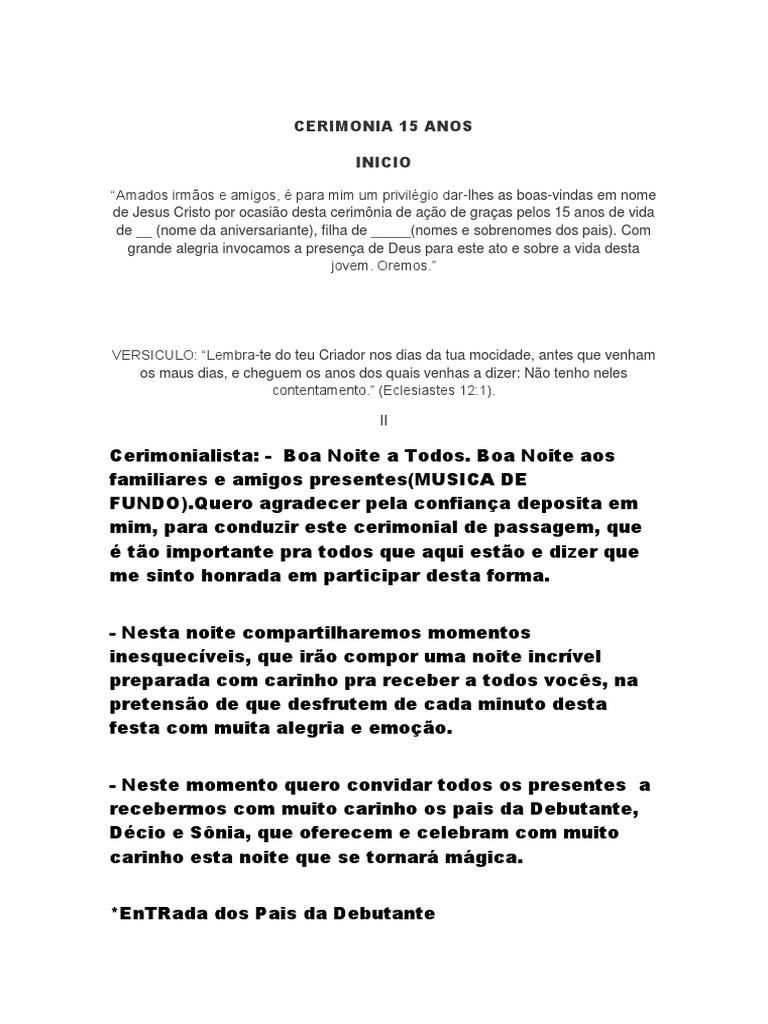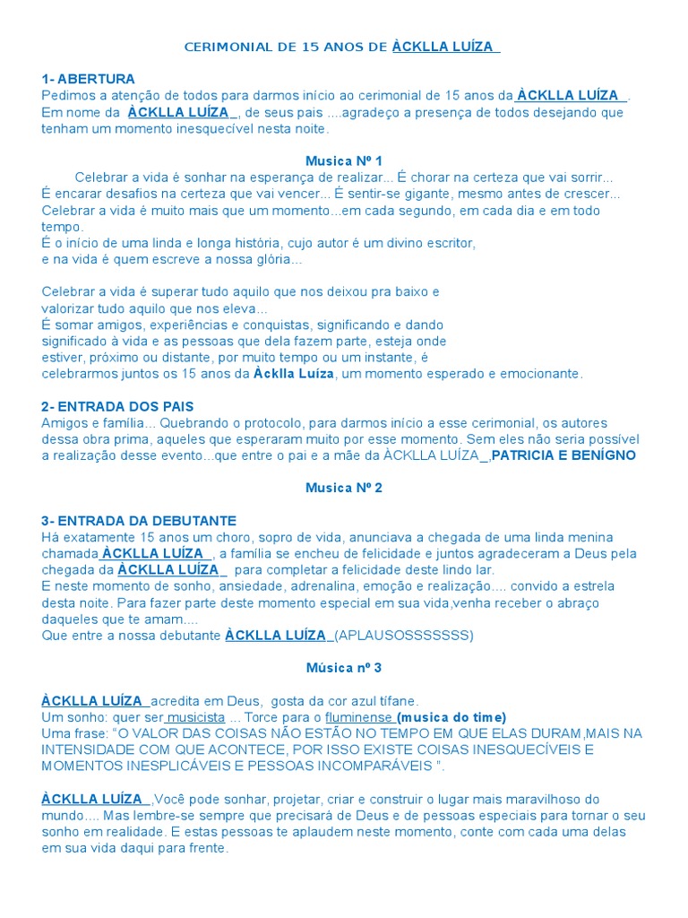 Exemplo de como deve ser um cerimonial de 15 anos. Olá Debutantes! Depois de ter recebidos alguns pedidos,de dicas de como montar,um cerimonial. Resolvi disponibilizar a vocês,um Exemplo de Cerimonial pronto,para vocês terem uma ideia de como fazer. Esse é apenas 1,de vários outros modelos de cerimonias que existem.