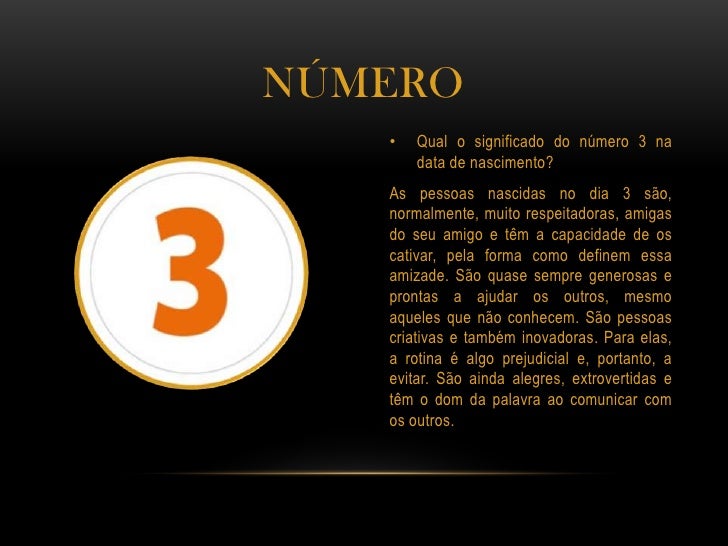 O significado do número 3 na numerologia é do otimismo e da alegria de viver intensamente. O número 3 é um dos nove símbolos muito importantes na numerologia dentre os números de um único dígito. Cada um dos números de 1 a 9 na numerologia tem um significado diferente - como sua própria personalidade que o diferencia dos outros.