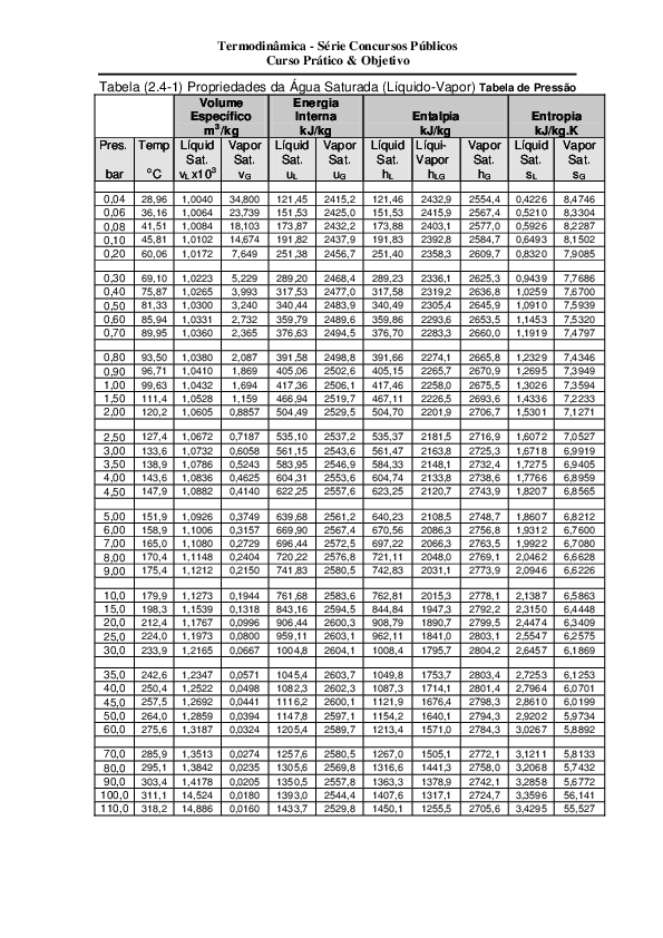 (PDF) Tabela (2.41) Propriedades da Água Saturada (LíquidoVapor) Tabela de Pressão Líquid Sat